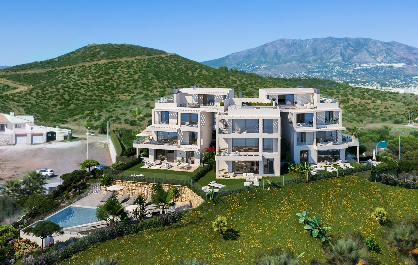 Luxus-Komplex von 9 exklusiven Gebäuden mit Blick auf das Mittelmeer und Gärten und einem Endlos-Pool. Wohnungen mit 2 und 3 Schlafzimmern, mit 2 Bädern, Garage und Abstellraum.