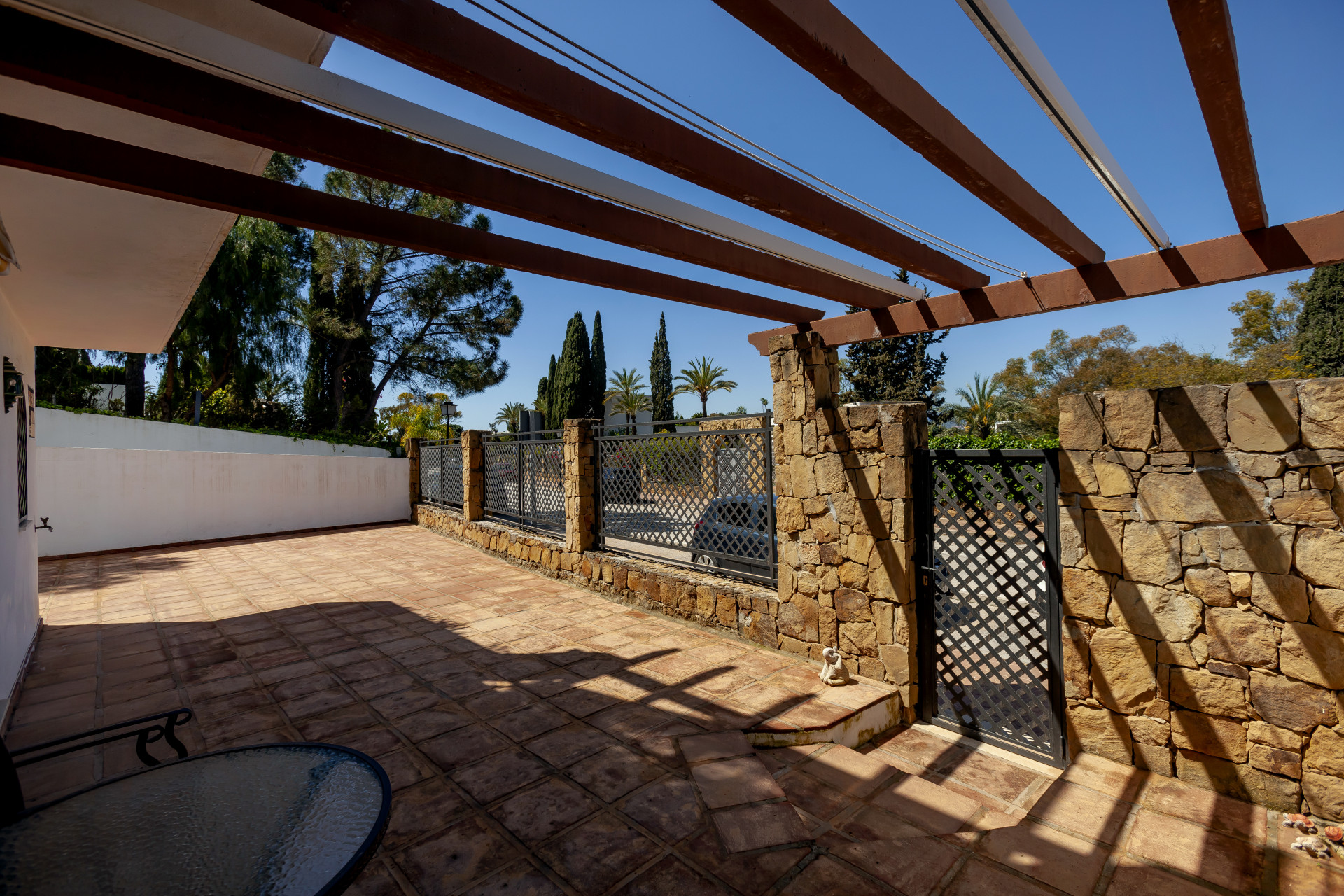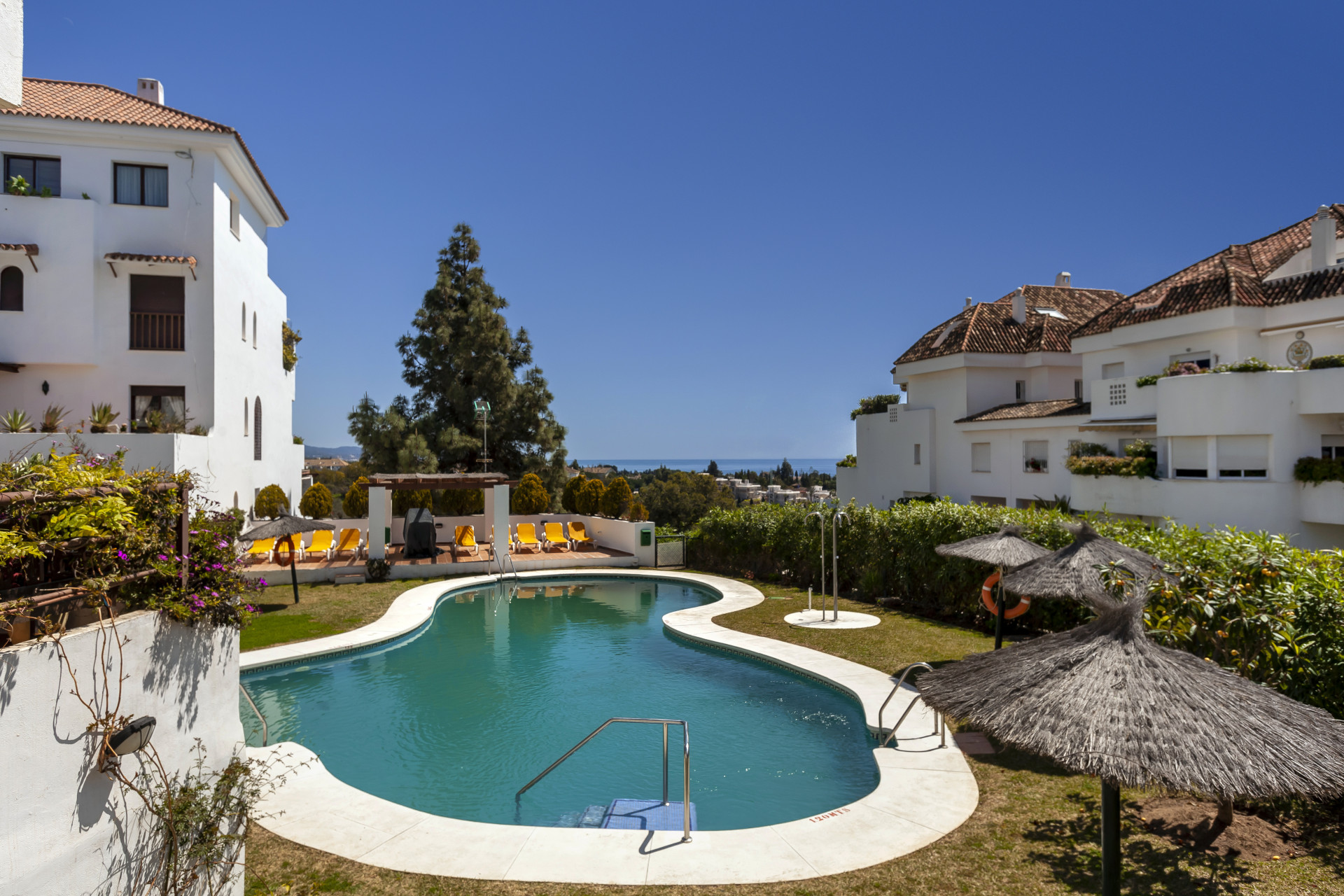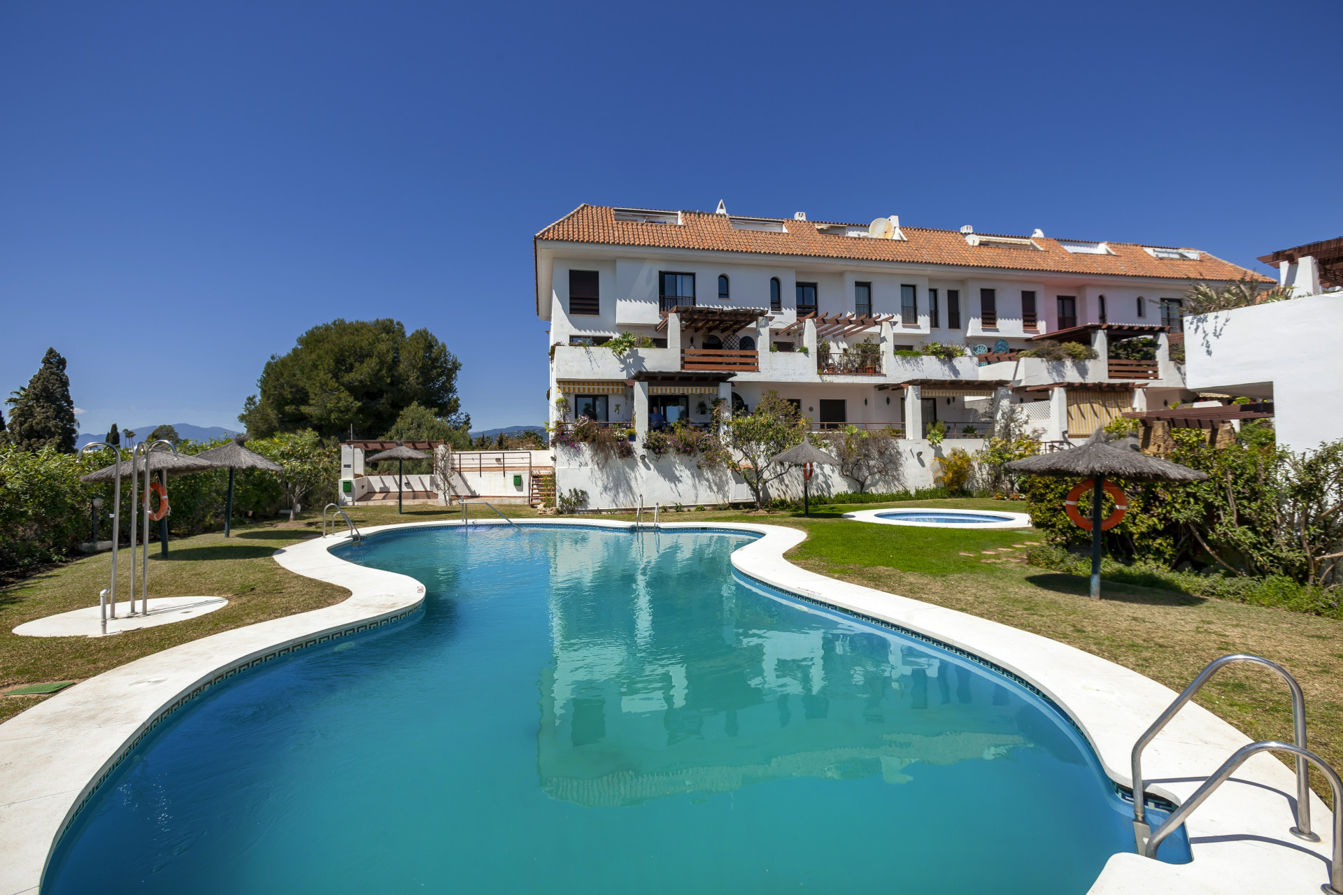 Precioso apartamento de tres dormitorios en planta baja, con orientación oeste, en la comunidad cerrada y bien establecida Coto Real; con cuidados jardines y piscinas comunitarias ya un corto trayecto en coche de Marbella, Puerto Banús y todos los servicios de ocio. Esta propiedad bien ubicada tiene; una sala de estar y comedor de planta abierta; cocina totalmente equipada con lavadero independiente y acceso a la gran terraza esquinera que podría convertirse en un hermoso jardín; tres habitaciones; y dos baños. Otras características incluyen aire acondicionado frío y calor, suelos de mármol, armarios empotrados, trastero, dos plazas de aparcamiento privado y servicio de conserjería.