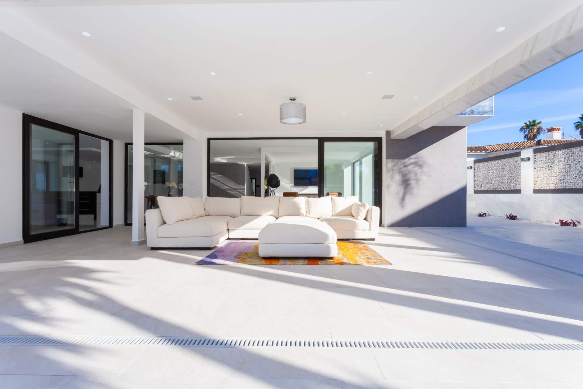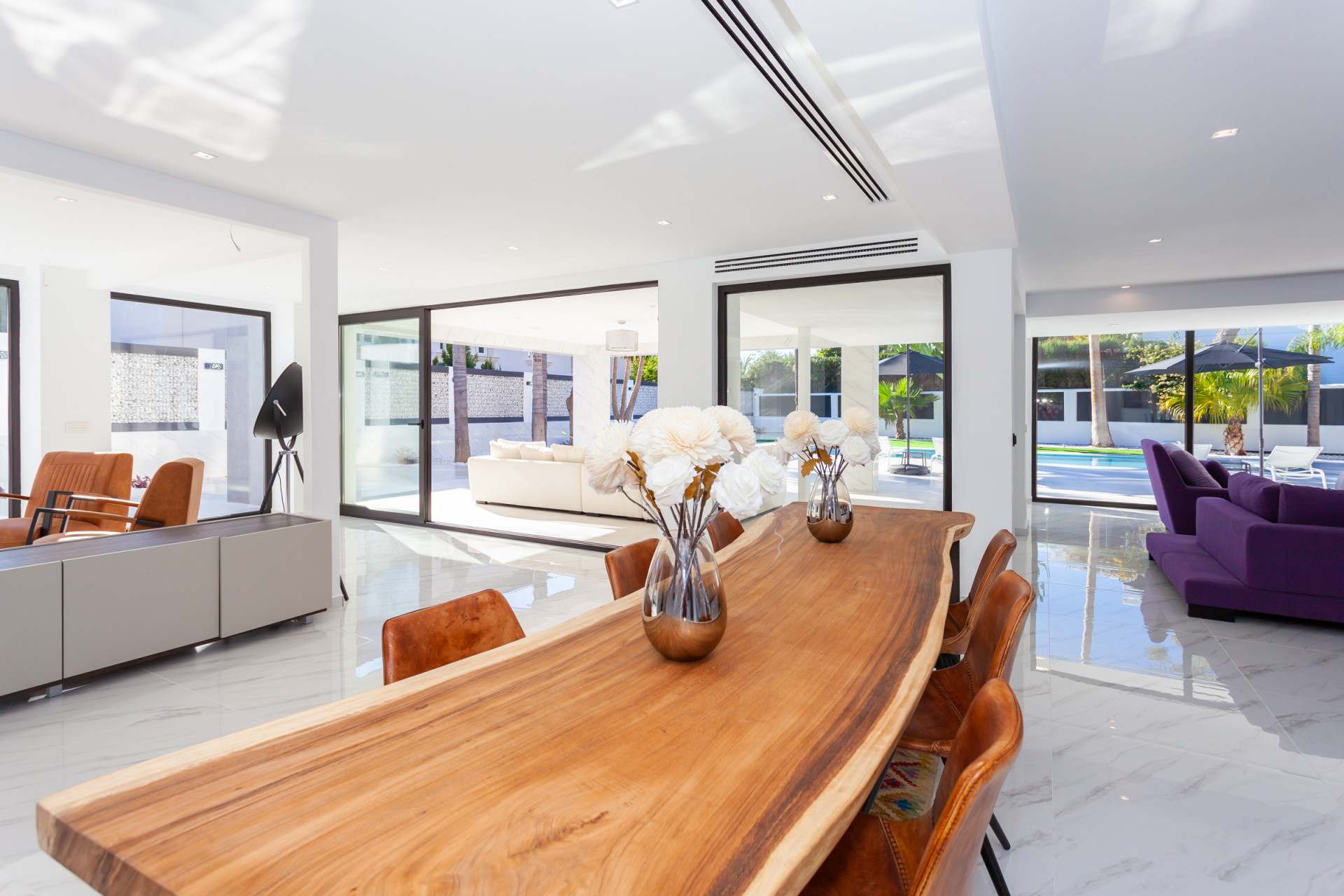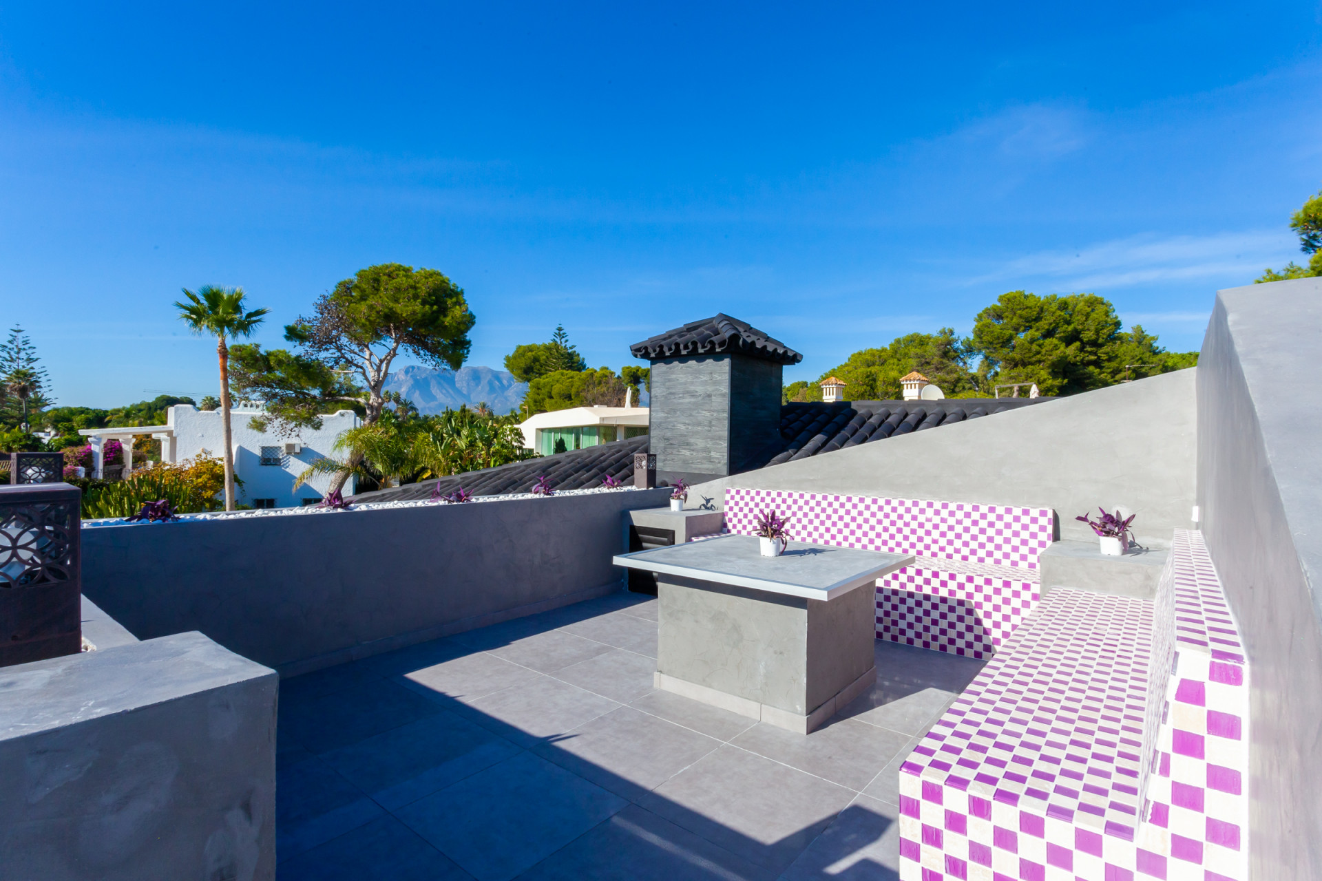 Fantástica oportunidad de comprar una exclusiva y moderna villa en la playa en la urbanización Los Monteros Playa, a sólo 70 metros de la playa. Esta fantástica villa tiene 5 dormitorios y 5,5 baños y ha sido recientemente renovada para alcanzar los más altos estándares, con gran atención a los detalles. Moderna pero confortable gran villa con hermosas zonas de estar abiertas, fantástica cocina de última generación con una hermosa isla y zona de estar. Hermosa terraza cubierta con acceso a la piscina. En la primera planta se encuentra el enorme e impresionante dormitorio principal con su propia chimenea, vestidor y un fantástico baño en suite con acceso a las grandes terrazas cubiertas y abiertas con vistas al jardín y a la zona de la piscina. También en este nivel hay otros 3 dormitorios con baños en suite, todos con acceso a las terrazas. En este nivel también hay un almacén. El cuarto dormitorio con baño en suite se encuentra en la planta baja con acceso al jardín delantero. Gran piscina climatizada (15 x 5) con cascada y jacuzzi en el jardín, ideal para relajarse, entretenerse y disfrutar de las grandes terrazas exteriores. Terraza en el techo, accesible a través de una escalera exterior, desde la cual se tiene una magnífica vista del mar y las montañas. Puedes estar en el centro de Marbella en 5 minutos o en Puerto Banús en 10 minutos o simplemente disfrutar de la hermosa playa que está a pocos pasos de tu puerta. El famoso Club de Playa de 5 estrellas Los Monteros y Le Cabane está a su puerta, con sus magníficas vistas panorámicas que lo convierten en uno de los mejores clubes de playa de Marbella. También tienen muchos grandes campos de golf en la zona y una buena selección de escuelas privadas internacionales.